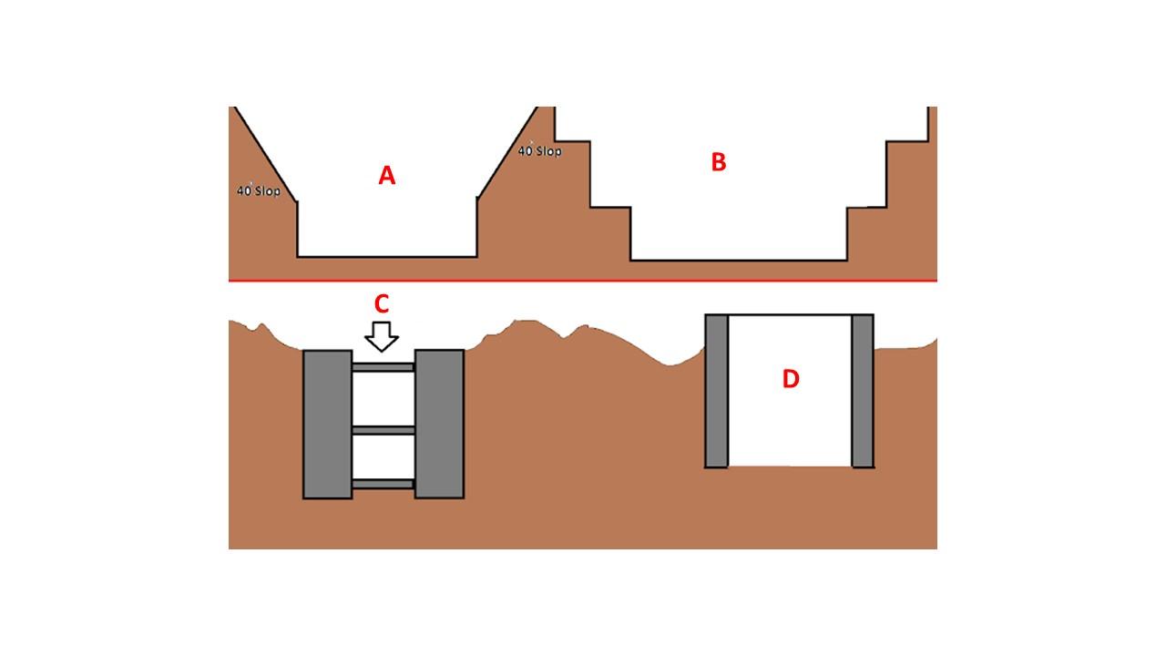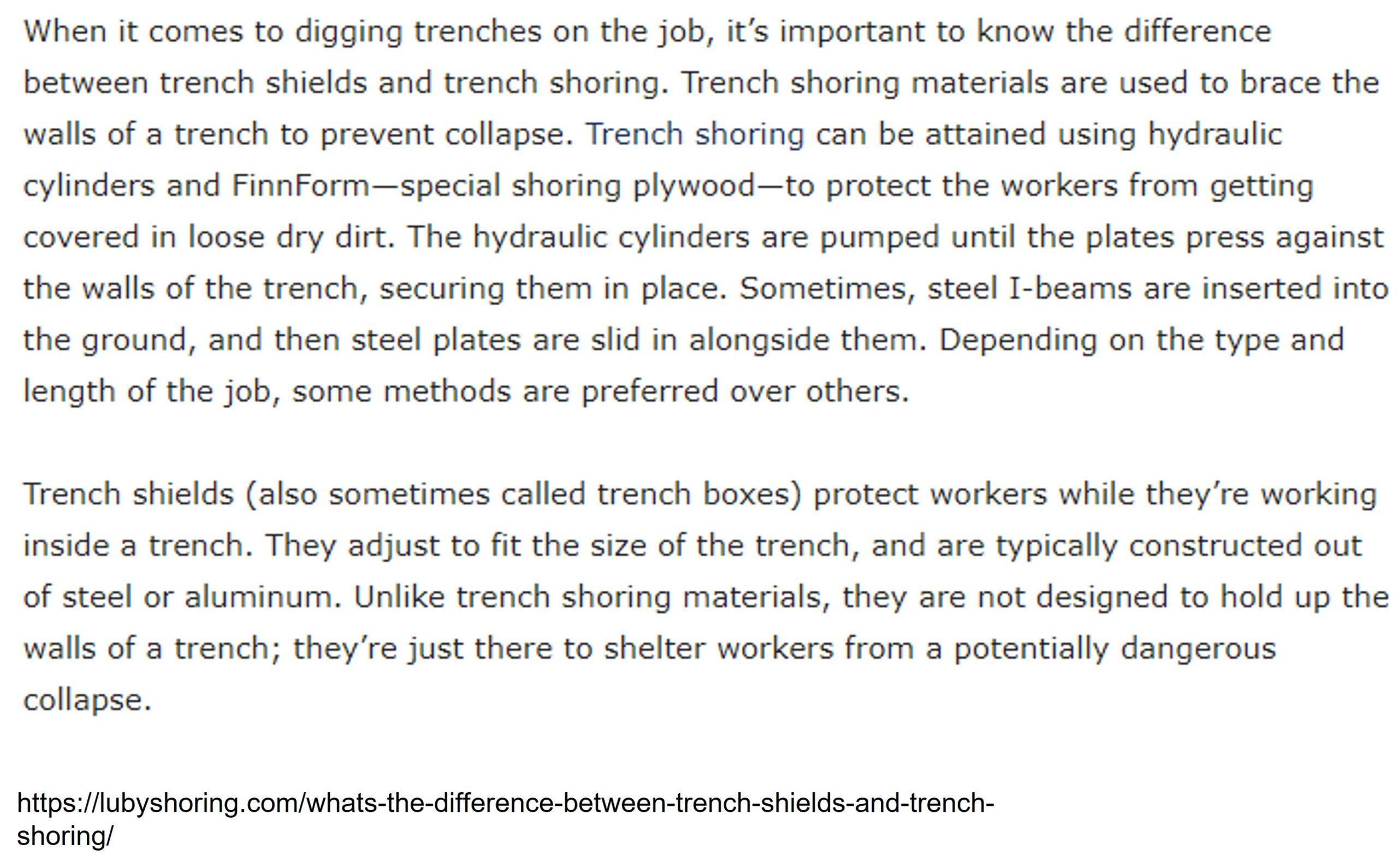 And study this text and graphic below for types of trench protective systems. These types of trench protective systems are needed when a trench is 5 feet or deeper unless the trench is made in stable rock.